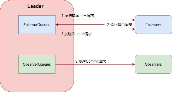 Leader 收到写请求后,首先必然是将写请求广播出去——发起提案(也就是将写请求的提案发送给所有 Follower),Follower 收到之后返回自身是否同意,若超过半数的 Follower 同意就可以给 Follower 和 Observer 发送 Commit 请求让它们进行写更新啦!