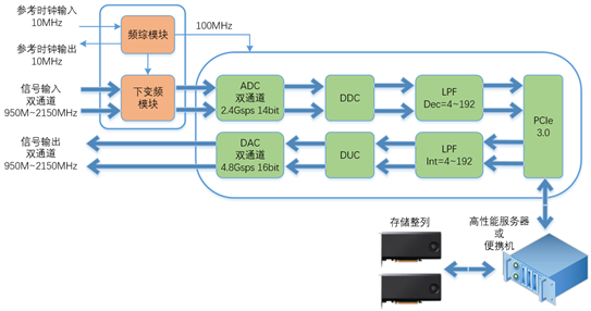 L波段采集回放系统是一套便携式模拟数字采集系统,该系统主要由射频输入模块、中频接收回放模块、FPGA信号处理单元、服务器系统和存储单元等组成。L波段采集回放系统的功能主要用于对950MHz〜2150MHz模拟量射频信号的采集、存储记录与回放;采集与回放信号瞬时带宽高达500MHz。将采集的射频数据通过PCIe接口存储至计算机磁盘阵列,并通过万兆光纤接口发送至本地服务器;除此,可以自定义或把存至本地服务器的数据进行重构播放。本设备主要用于记录试验现场数据并具有类示波器显示能力及数据导出能力,支持长时间不间断采集及事后数据分析和处理。L波段采集回放系统是卫星、雷达等应用的理想工具。