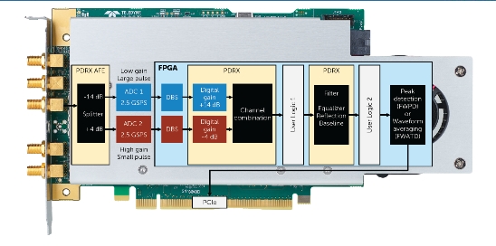 附加板载FPGA实时数字信号处理,包括:数字基线稳定器(DBS),用于精确的温度补偿基线,作为确定峰值高度的稳定参考。脉冲检测固件(FWPD)用于数据压缩为FPGA中的峰值列表。先进的时域固件(FWATD),用于在FPGA中通过阈值和平均波形来抑制噪声。