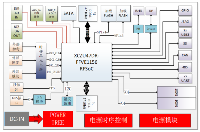 基于ZU47DR的高性能板卡是一款最大可提供8路ADC接收和8路DAC发射通道的高性能板卡,板卡选用高性价比的Xilinx的Zynq UltraScale+ RFSoC系列中XCZU47DR-FFVE1156作为处理芯片。