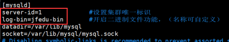 vim /etc/my.cnf #主配文件路径根据实际情况修改 server-id=1 #设置主库集群唯一标识 log-bin=jfedu-bin #主库开启二进制文件功能,(名称可自定义)