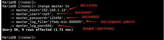 change master to master_host="192.168.1.13", master_user="root", master_password="123456", master_log_file="jfedu-bin.000005", master_log_pos=699;