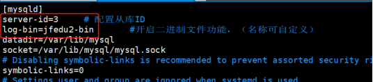 vim /etc/my.cnf server-id=3 #设置从库ID log-bin=jfedu2-bin #从库开启二进制文件功能,实现互为主从,(名称可自定义) # 注意:这里server-id的值可以是除1之外的任意数字,切记不能为1,也不能与其他从库id冲突。