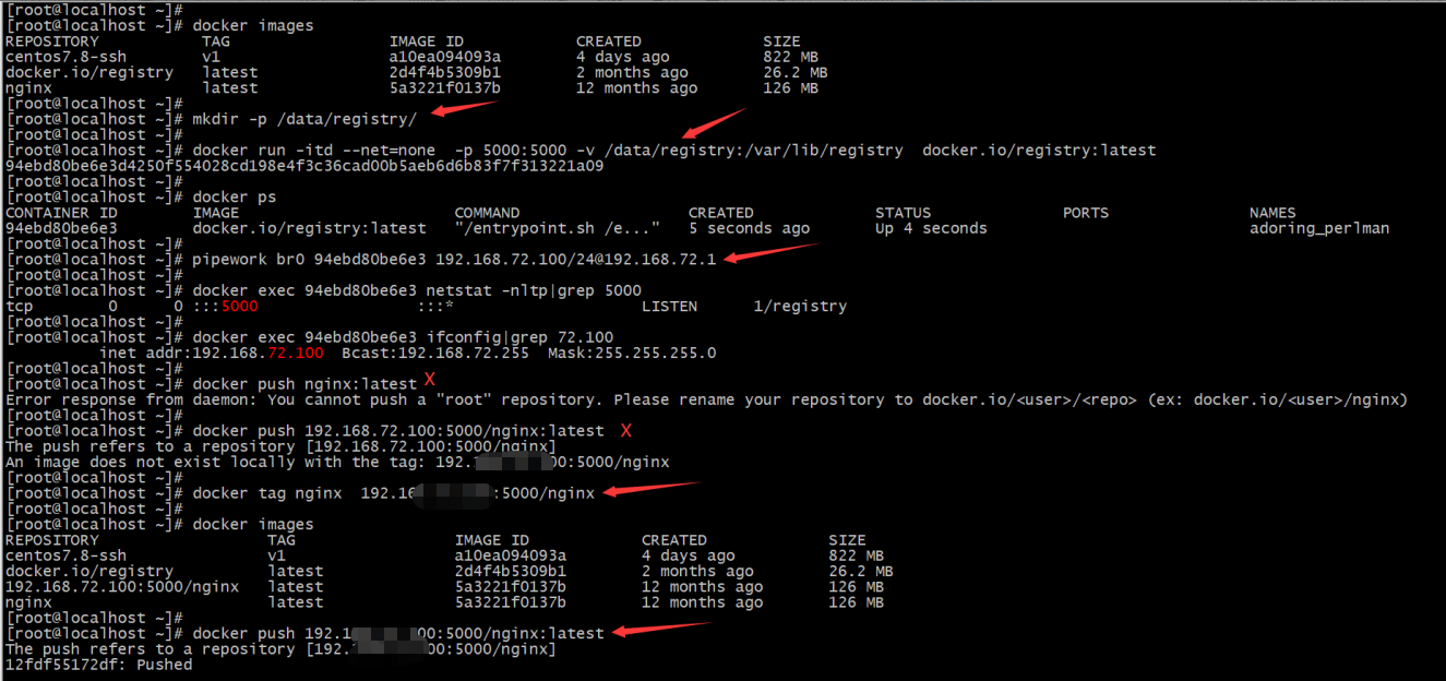 默认情况下,直接push接上镜像名,是传向docker官方仓库,这就会导致报错;我们应该是传到自己的私有仓库192.168.0.100仓库中,此时又会报错,说本地没有这个镜像,这是因为docker在push时把 [192.168.1.100:5000/nginx] 这个看成是一个地址了;我们需要把原本的镜像名tag改一下,其实就是伪装一下,伪装成是一个往仓库传的镜像,其实 [192.168.72.100:5000/nginx] 可以理解为就是一个镜像名称,告诉docker push这是一个指令,这样就可以上传了。