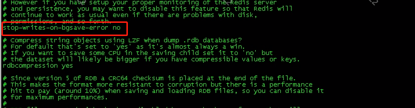 修改redis.conf文件:vim 打开redis配置的redis.conf文件,然后使用快捷匹配模式:/stop-writes-on-bgsave-error定位到stop-writes-on-bgsave-error字符串所在位置,接着把后面的yes设置为no即可。