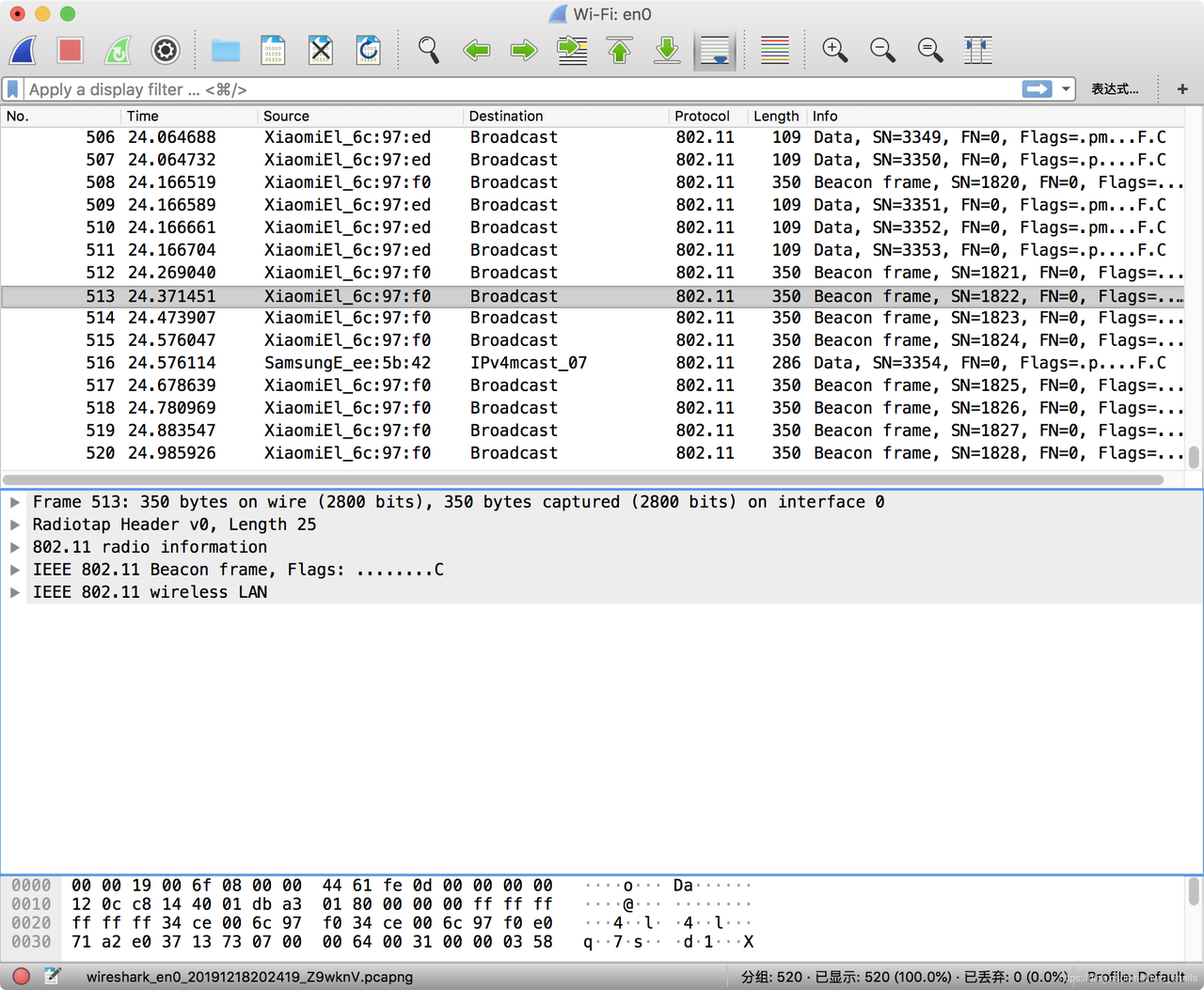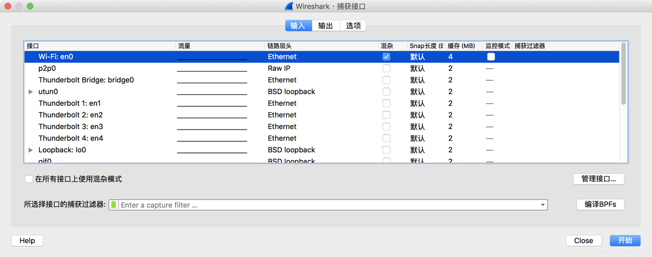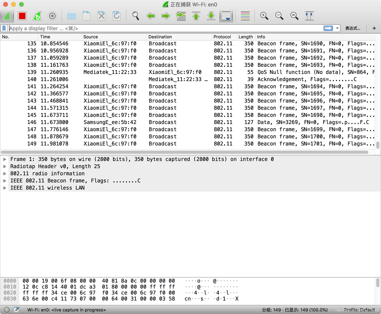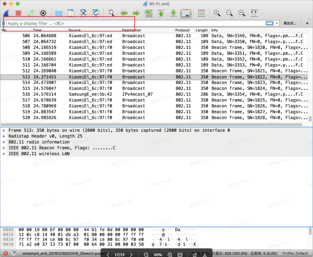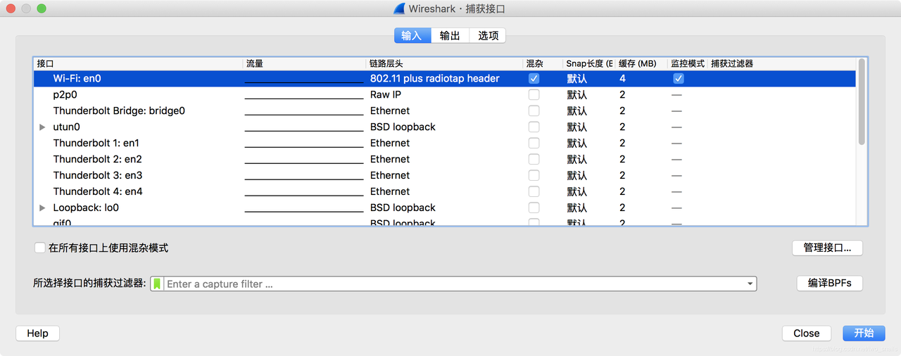 此时无线嗅探已经开始工作,sniffer已经开始运行,Wi-Fi封包已经源源不断的传输到了wifi网卡的interface:en0上。