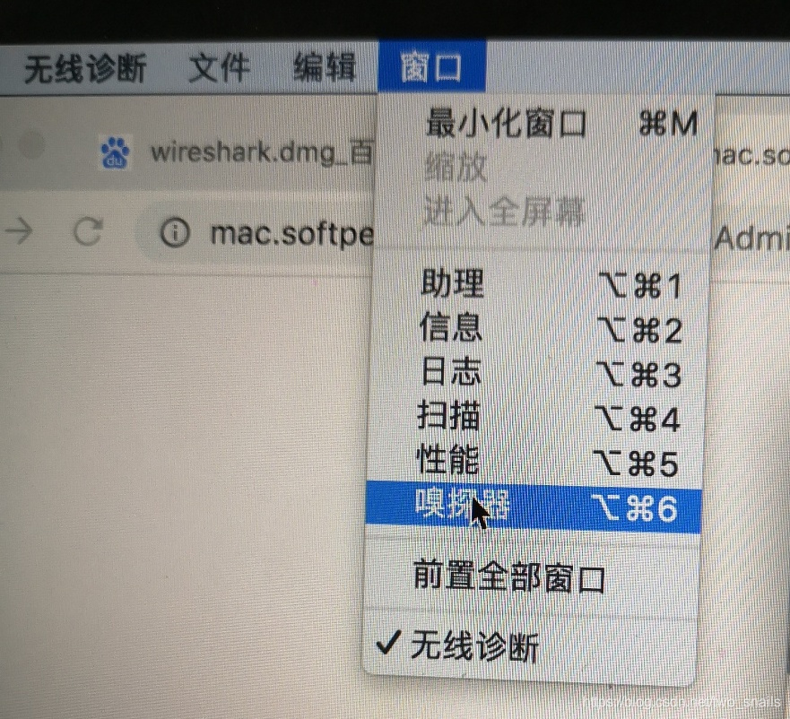 4)首先点击无线诊断界面,在屏幕最上方的菜单栏里面,看到“窗口”菜单。