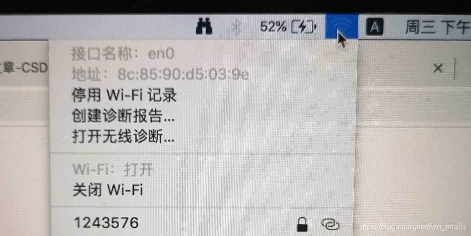 1)按着MacBook的option键,用鼠标左键点击Wi-Fi图标。
