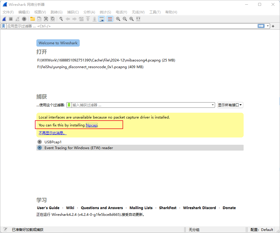 - 打开wireshark之后,需要再下Npcap,根据提示下载安装
