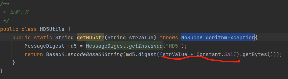 return Base64.encodeBase64String(md5.digest((strValue + Constant.SALT).getBytes()));