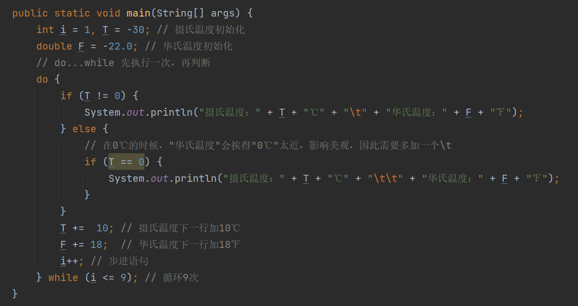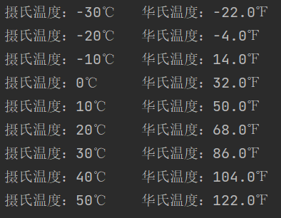题目:使用do...while,在控制台输出摄氏温度与华氏温度的对照表。对照表从摄氏温度-30℃到50℃,每行间隔10℃,运行结果如下: