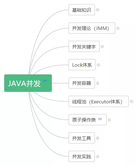 基础知识、并发理论(JMM)、并发关键字、Lock体系、并发容器、线程池(Executor体系)、原子操作类、并发工具、并发实践。如下图所示