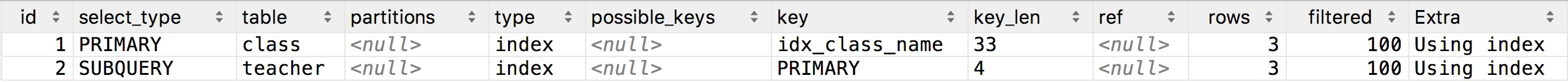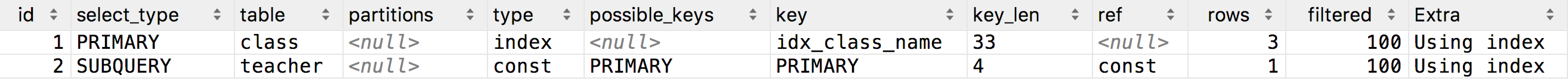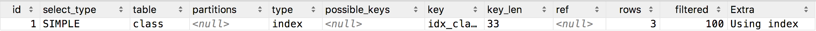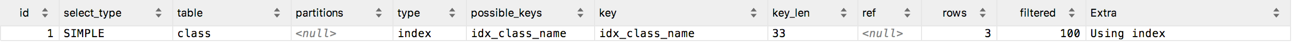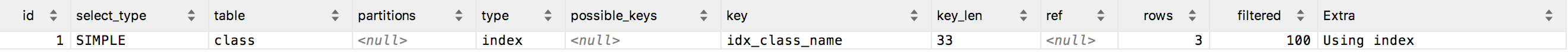 在class.class_name建立了idx_class_name索引,此时查询时Extra是Using index,使用了索引列排序,