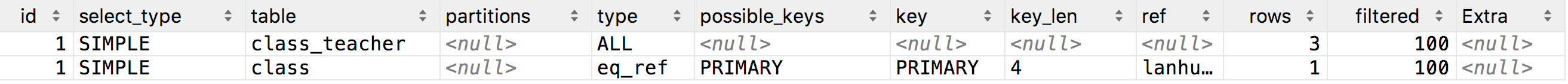 mysql> explain select * from class_teacher left join class on class_teacher.class_id = class.id;