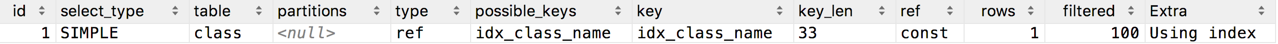 mysql> explain select * from class where class_name = 'class1';