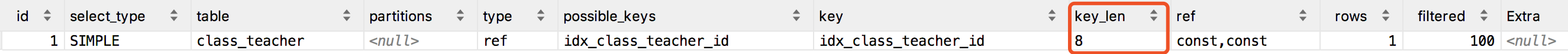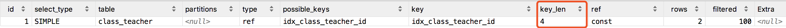 因为我们的class_id和teacher_id都是int类型,所以key_len存的是使用到的索引字段类型字节长度。