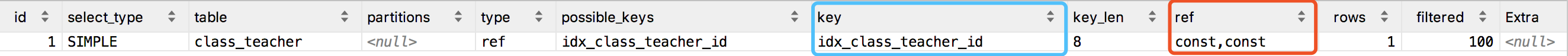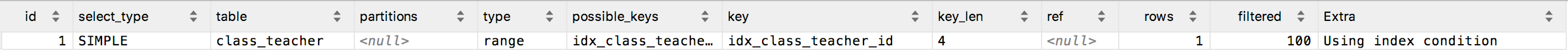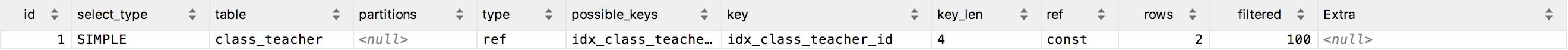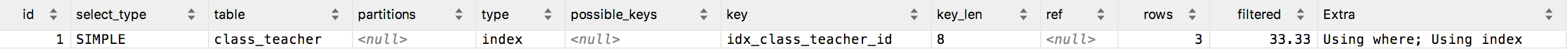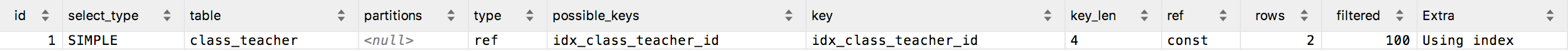 mysql> explain select class_id from class_teacher where teacher_id = 1;