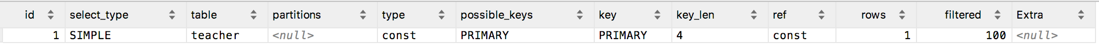 mysql> explain select teacher_name from teacher where id = 1;