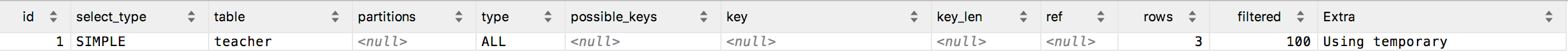 mysql> explain select distinct teacher_name from teacher;