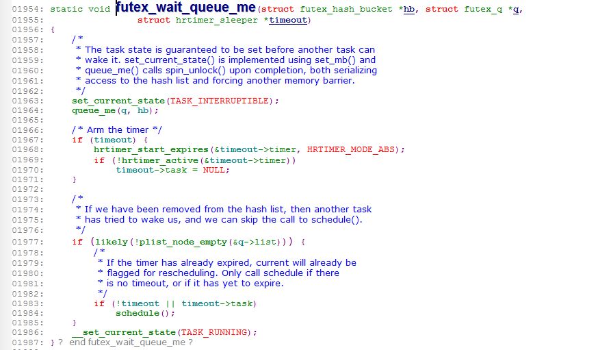 我们看到出现这种夯死现象的程序,大多线程都会停在 内核的 futex_wait_queue_me 这个函数处;而这个函数,使用 TASK_INTERRUPTIBLE 来设置自己的状态,表示自己主动想放弃CPU,但可以被中断、信号或其他程序唤醒;并在下面调用 schedule 内核调度方法,主动通知内核放弃自己的CPU。