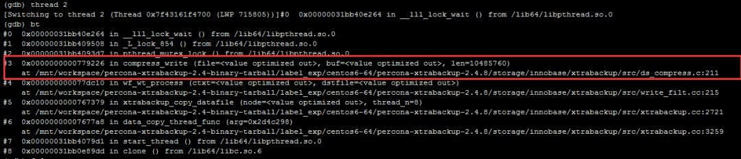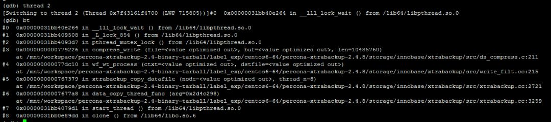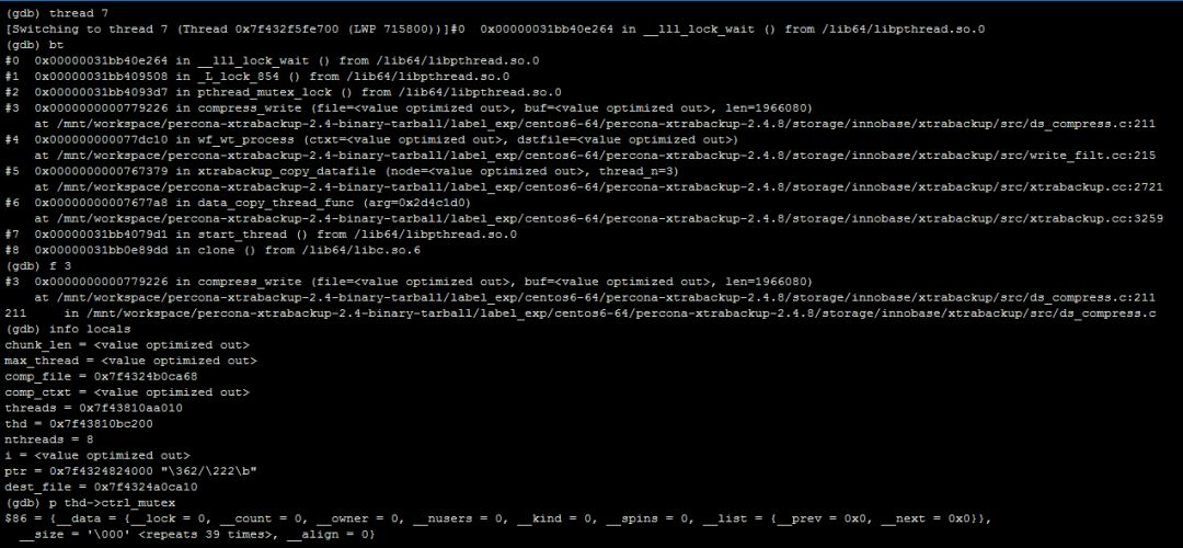 我们看到7# 线程hang死的位置与2号线程是相同,不同的是 它是卡在第3个压缩线程上,且其ctrl_mutex的owner为空。也就是说没有与其竞争的线程,它自己就一直在这等。