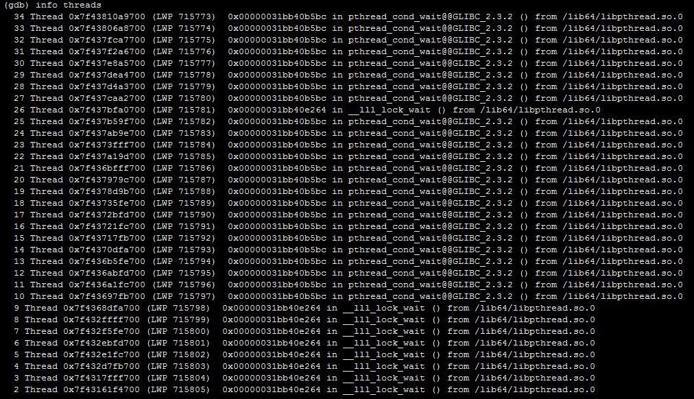 可以看到线程大体有两类等待, pthread_cond_wait 和 __lll_lock_wait。