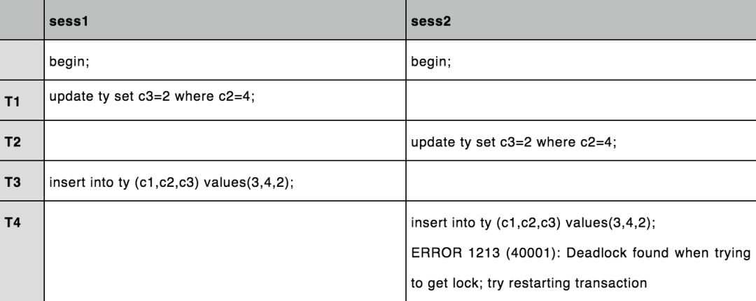 T7 与sess2 类似 sess3 执行update 操作需要申请 c=4 的行锁,与 sess2 的持有的 Lock S Next-key Lock 不兼容,等待 sess2 释放 Lock S Next-key Lock 。出现循环等待,发生死锁。