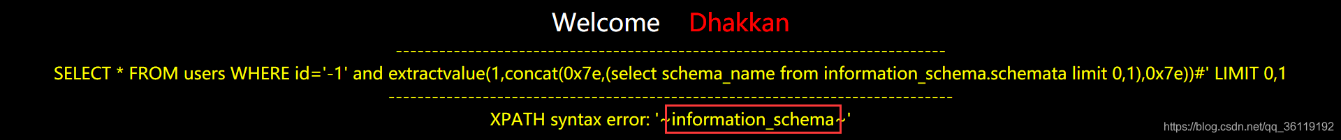'and extractvalue(1,concat(0x7e,database(),0x7e))and '1'='1 #我们可以将 database()修改为任何的函数