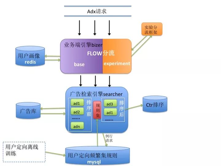 在业务引擎端,我们会进行A/B分流实验,随机划分一定百分比的流量作为实验流量,用于进行用户定向实验。之后,分析一段时间的累积实验结果,与base分流作对比,以检测用户定向策略带来的转化率提升,同时反馈给上游频繁集模型,用于干预调整离线产出模型。