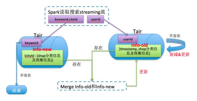 对于关键词定向,与用户定向的一个区别在于前者时效性要求很高,因此需要使用实时计算系统来处理用户行为,并将最后的结果保存在Tair集群。首先通过Kafka订阅用户行为实时流,以五分钟为时间片处理用户行为,查找用户ID和搜索词,如果搜索词过长,则进行分词,接着从Tair中查找出与该搜索词相关的店铺及店铺分类和打分(离线模型给出)。接下来会Tair中查找该用户ID是否有历史结果,若有,则读出,对之前的打分进行衰减(衰减方案见下文),并与当前新的打分进行合并;否则,将新的数据及时间戳写入Tair。该方案的流程图如下: