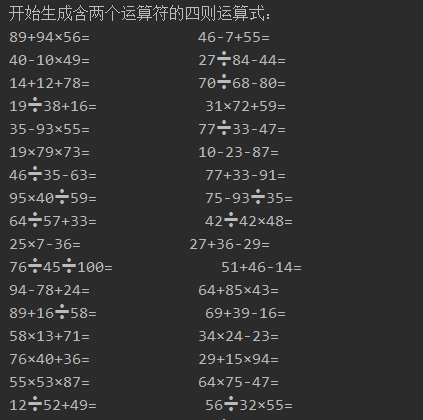 import time import numpy as np sgn=['+','-','×','➗'] sgn2=['+','-','*','/'] print('开始生成含两个运算符的四则运算式:') for i in range(0,300): strq=str(np.random.randint(1,101))+sgn[np.random.randint(0,4)]+str(np.random.randint(1,101))+sgn[ np.random.randint(0,4)]+str(np.random.randint(1,101))+'=' #随机生成含两个运算符的四则运算式并保存在strq中 if i%2==0: print(strq+' ' ,end="") else: print(strq) time.sleep(10) print("开始生成含两个运算符且结果在100以内的的四则运算式:") num=0 while True: sgn_lindex=np.random.randint(0, 4)#第一个运算符下标 sgn_rindex=np.random.randint(0,4)#第二个运算符下标 a=np.random.randint(1,101) b=np.random.randint(1,101) c=np.random.randint(1,101)#三个运算项下标 str1=str(a)+sgn2[sgn_lindex]+str(b)+sgn2[sgn_rindex]+str(c) #生成便于表达式计算的字符串 str2=str(a)+sgn[sgn_lindex]+str(b)+sgn[sgn_rindex]+str(c) #生成数学表达字符串 res=eval(str1)#计算表达式 if res<=100 and res>=0:#判断算式结果是否小于100大于等于0 if num % 2 == 0: print(str2+'='+"%.2f" % res+' ',end="") else: print(str2+'='+"%.2f" % res) num+=1 if num==300: break