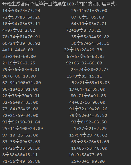 3.第一次随机生成含两个运算符的算式无结果要求。第二次随机生成计算结果在100以内的算式,并且算式结果保留两位小数。