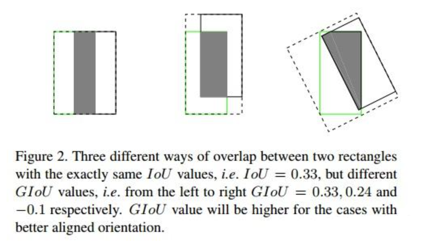 如图,三种情况下的IoU 值相同,但我们更倾向于第一种情况。IoU 作为损失函数时,不一定得到第一种情况。