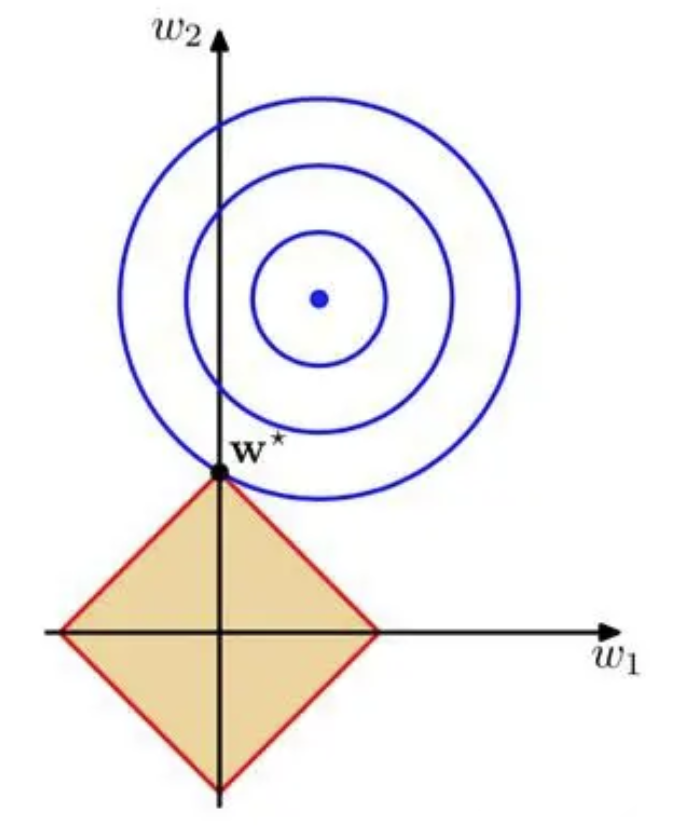 多数情况下,黄色区域的顶点处,取到最优解$w^* $。而顶点都是在轴上的,代表有的模型参数为0,所以L1 可以进行特征选择。