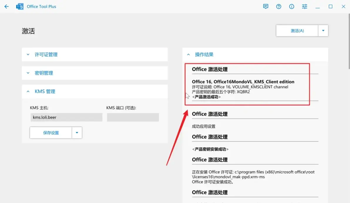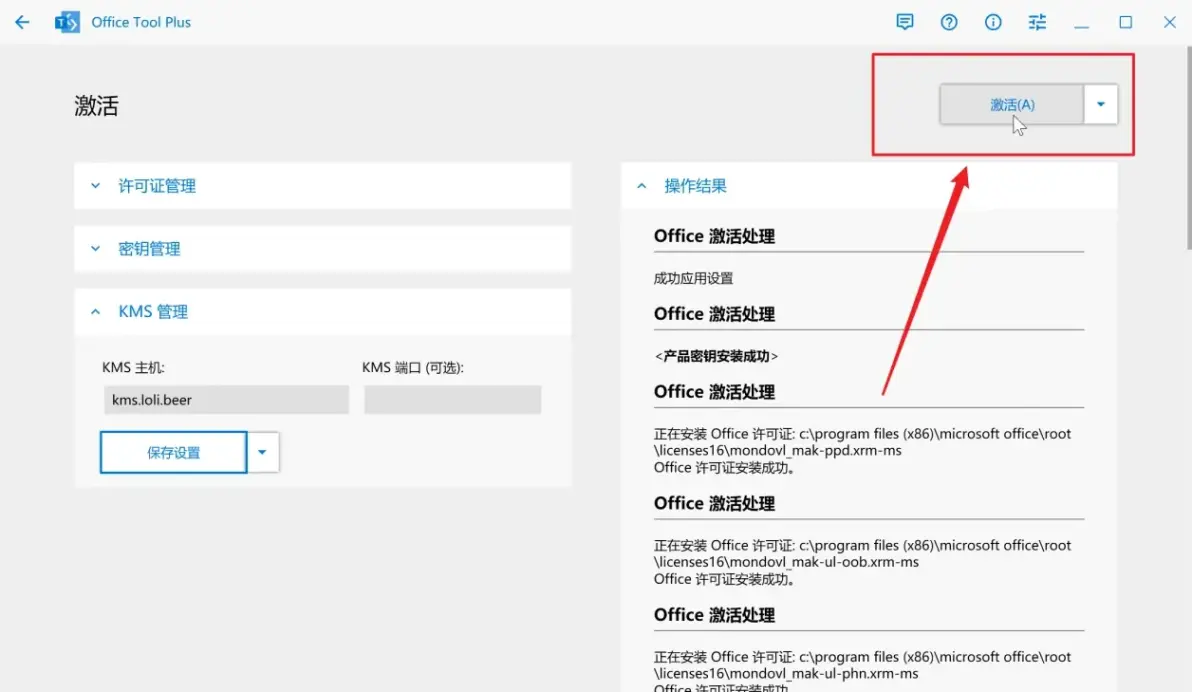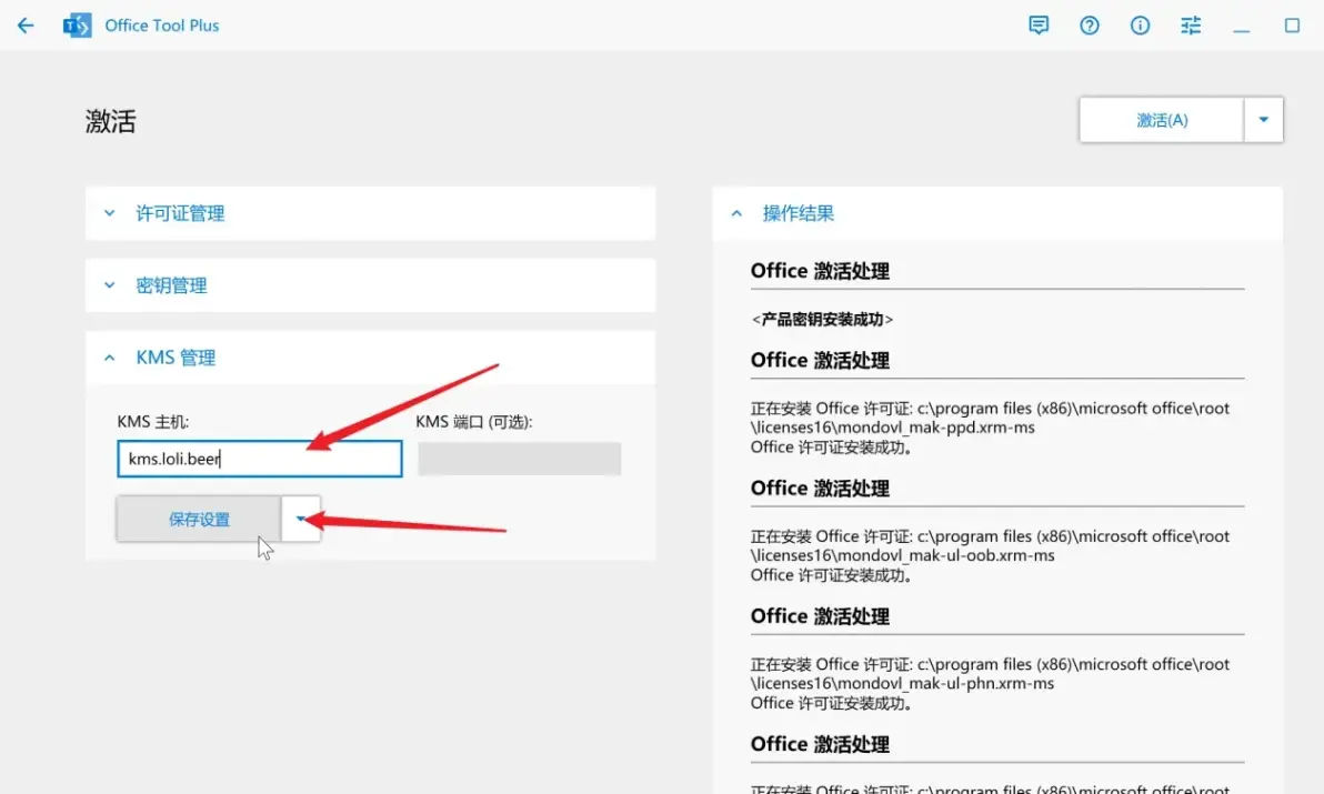 9、许可证安装完成后,切换到「KMS管理」栏目。在「KMS主机」里填上KMS服务器,这里我填的是kms.loli.beer,你也可以用这个,如果无法使用的,新的KMS服务器请到这里查找(https://www.coolhub.top/archives/14)。填完KMS主机后,点击「保存设置」按钮