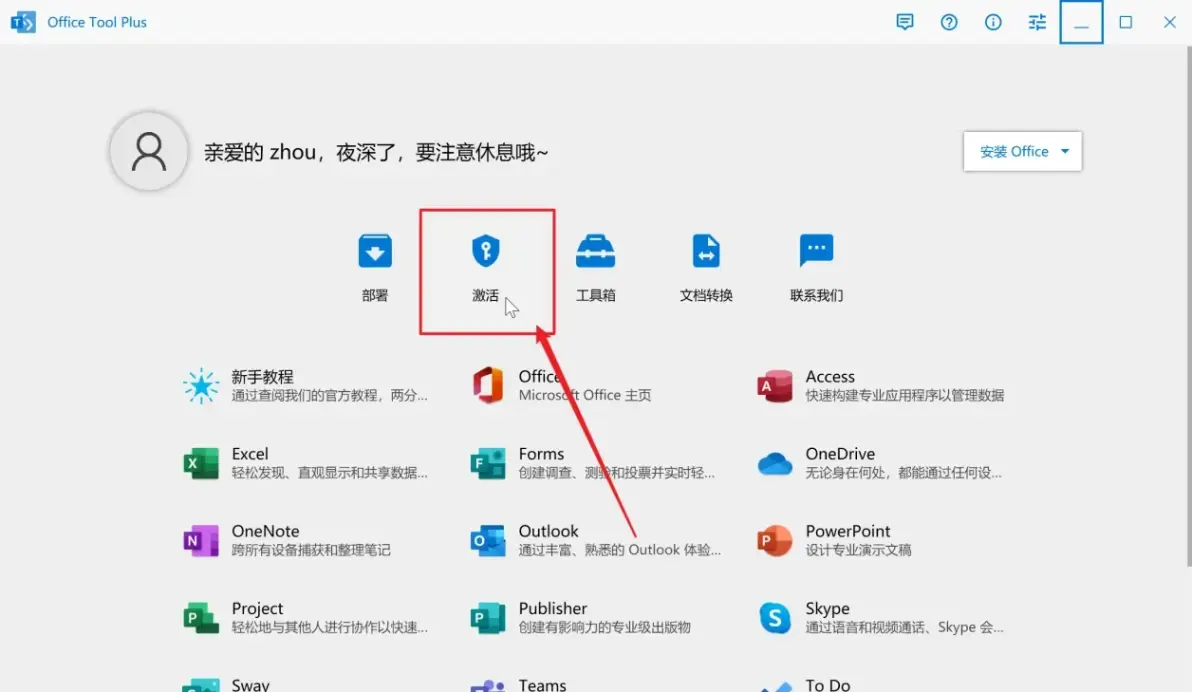 3、运行库组件装上之后,会自动打开Office Tool Plus软件,然后点击「部署」按钮