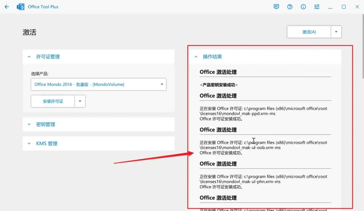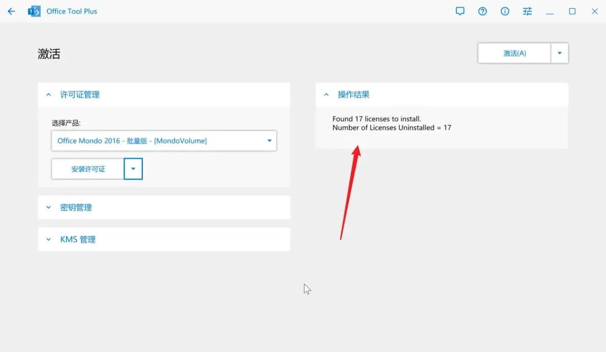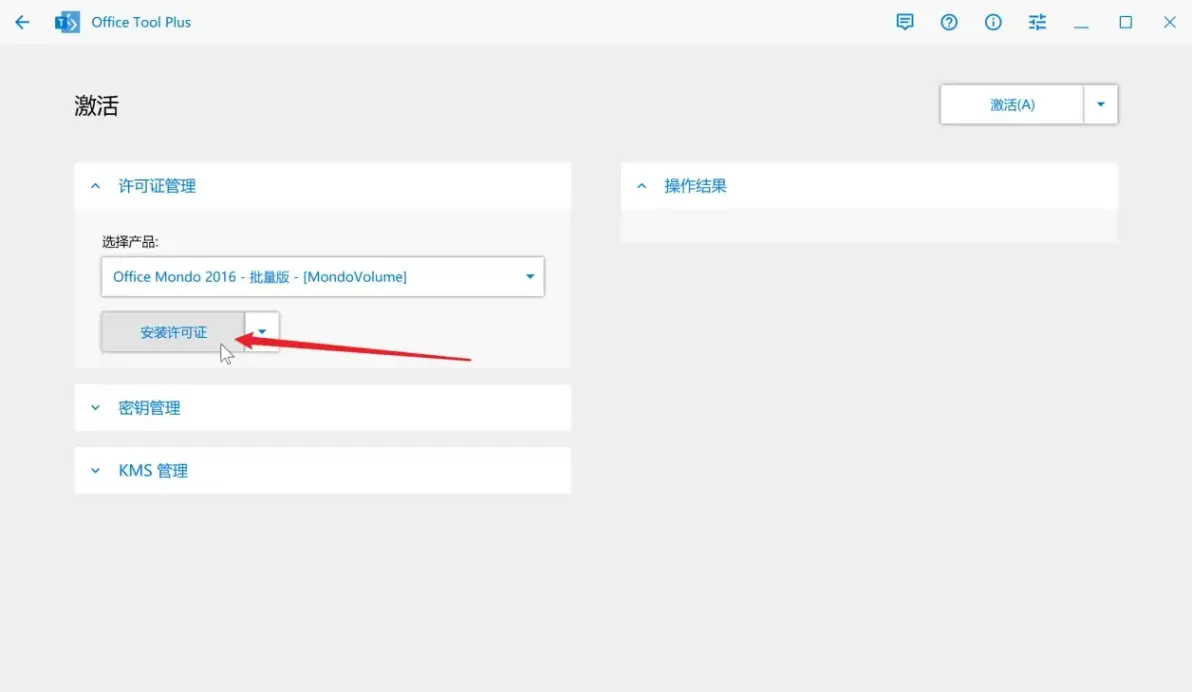 6、在许可证管理里,选择「Office Mondo 2016 - 批量版」,点击安装许可证(别问为什么,这是唯一可以免费使用365的途径)