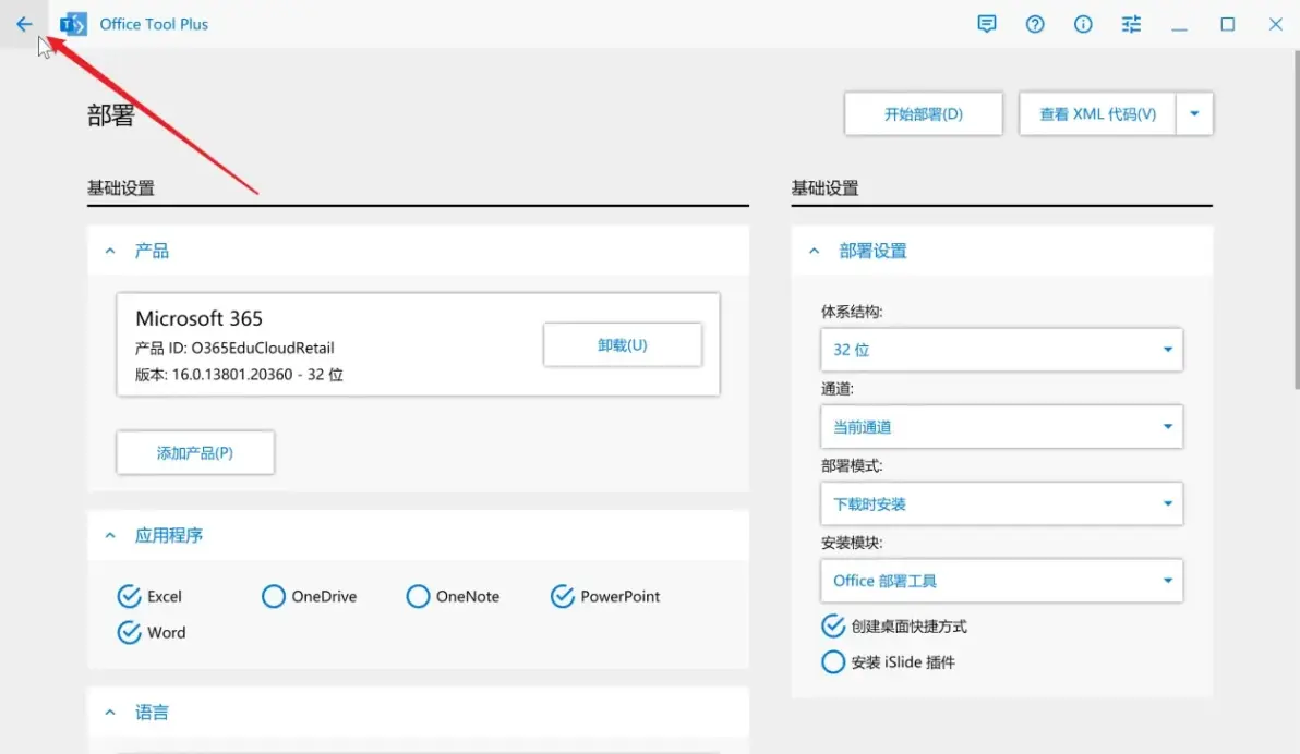 1、 还是Office Tool Plus软件,点击左上角的返回按钮,返回到主页