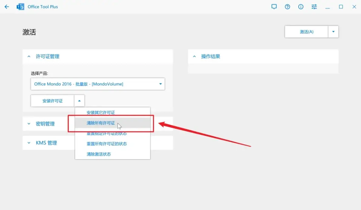 3、来到激活界面,在许可证管理里,点击安装许可证右侧的下拉三角△符号,点击「清除所有许可证」