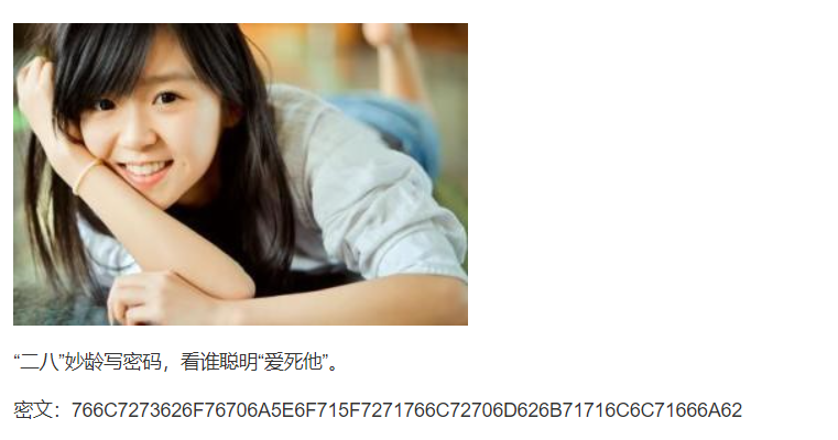 “二八”结合密文中字母没有大于F的,所以基本确定指16进制。可以发现奇数位的值不是6就是7,可以大胆猜测是两位一组组成的十六进制数。“爱死他”经同学提示(实在是想不到谐音)为ASCII的意思。(即使没有此提示,观察数字的值也很容易联想到字母到数字的映射是通过ASCII码实现的)