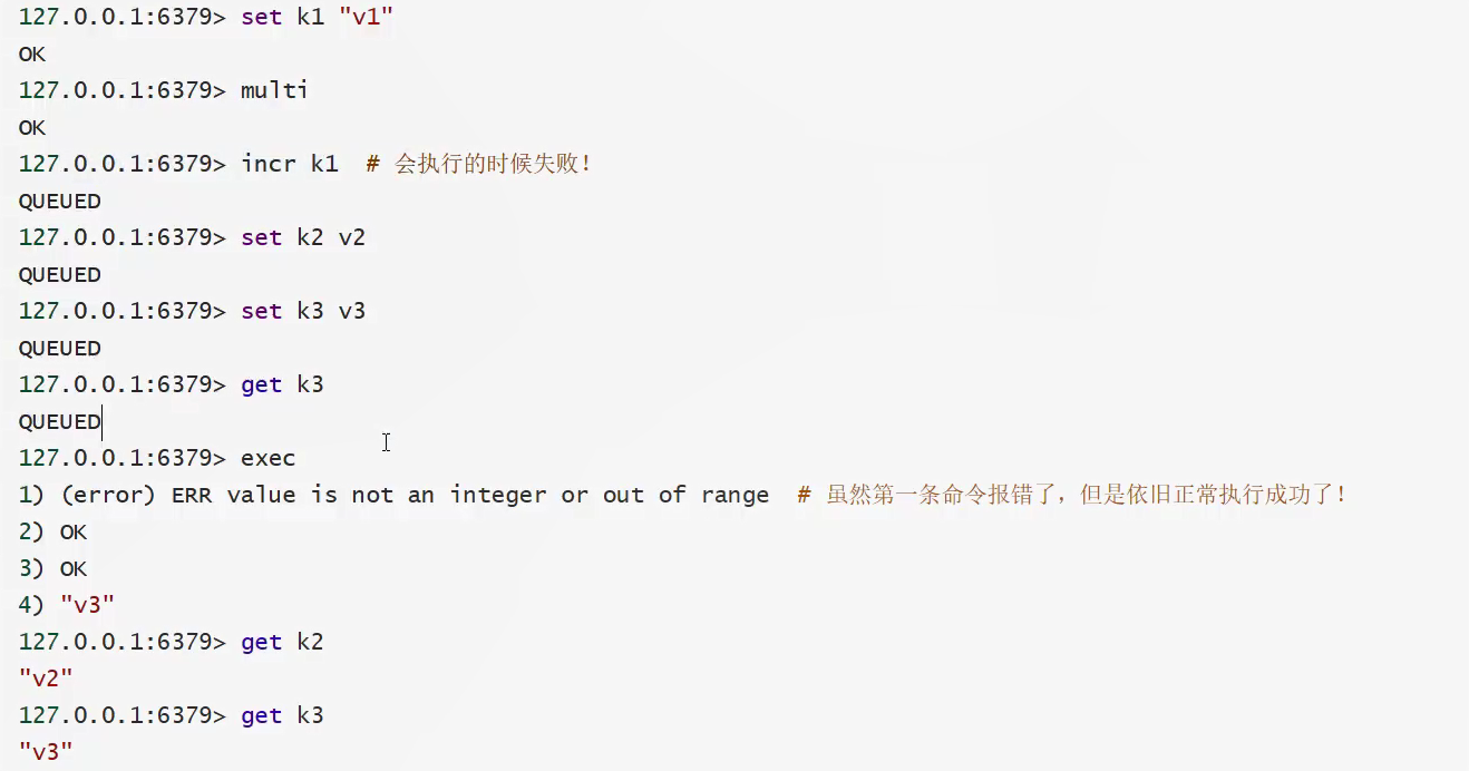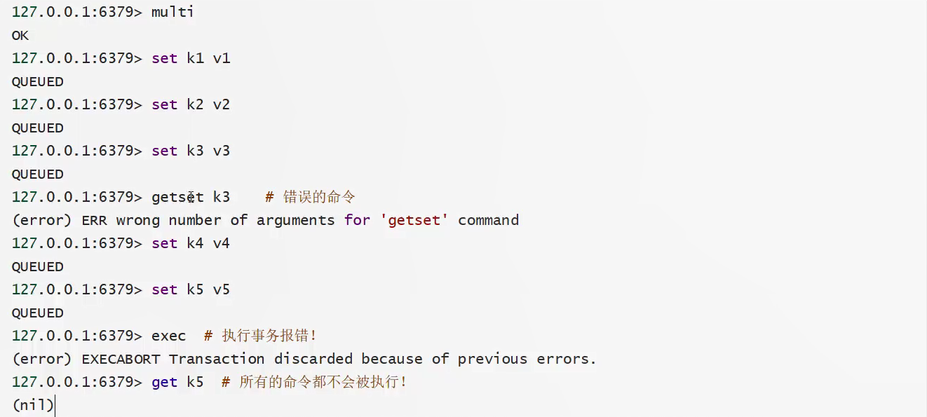 编译型异常(代码有错,不通过编译):事务中所有的命令都不会被执行。
