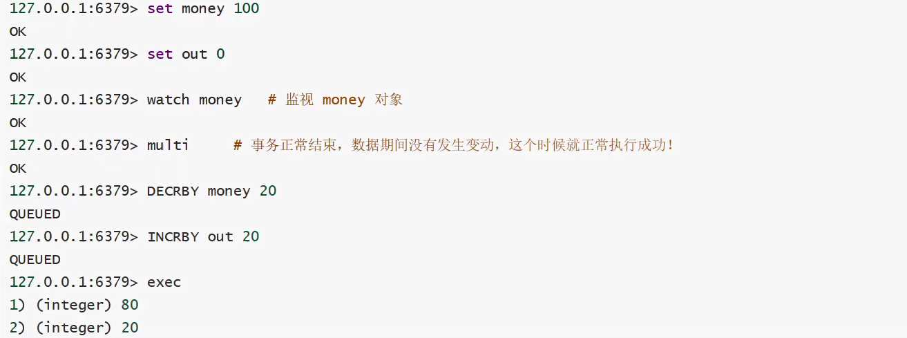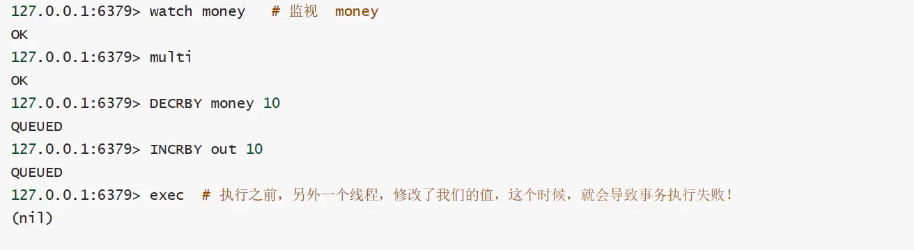 Redis监视money的时候,当另一个线程去修改了money,此时事务会执行失败。这个时候需要先去执行unwatch key [key...]将money进行解锁,然后在进行具体操作。Redis watch命令可用作乐观锁实现。