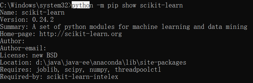 python -m pip show scikit-learn # 查看scikit-learn安装的位置及安装的版本 python -m pip freeze # 查看所有在虚拟环境中已下载的包 python -c "import sklearn; sklearn.show_versions()"