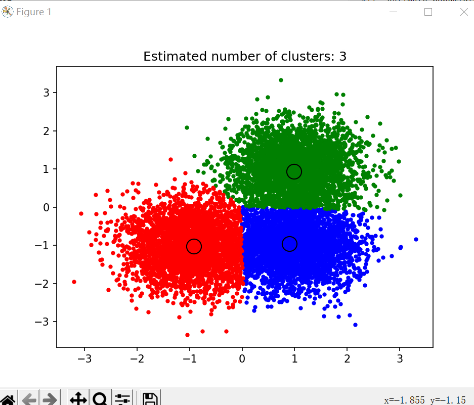 print(__doc__) import numpy as np from sklearn.cluster import MeanShift, estimate_bandwidth from sklearn.datasets import make_blobs # ############################################################################# # Generate sample data centers = [[1, 1], [-1, -1], [1, -1]] X, _ = make_blobs(n_samples=10000, centers=centers, cluster_std=0.6) # ############################################################################# # Compute clustering with MeanShift # The following bandwidth can be automatically detected using bandwidth = estimate_bandwidth(X, quantile=0.2, n_samples=500) ms = MeanShift(bandwidth=bandwidth, bin_seeding=True) ms.fit(X) labels = ms.labels_ cluster_centers = ms.cluster_centers_ labels_unique = np.unique(labels) n_clusters_ = len(labels_unique) print("number of estimated clusters : %d" % n_clusters_) # ############################################################################# # Plot result import matplotlib.pyplot as plt from itertools import cycle plt.figure(1) plt.clf() colors = cycle('bgrcmykbgrcmykbgrcmykbgrcmyk') for k, col in zip(range(n_clusters_), colors): my_members = labels == k cluster_center = cluster_centers[k] plt.plot(X[my_members, 0], X[my_members, 1], col + '.') plt.plot(cluster_center[0], cluster_center[1], 'o', markerfacecolor=col, markeredgecolor='k', markersize=14) plt.title('Estimated number of clusters: %d' % n_clusters_) plt.show()