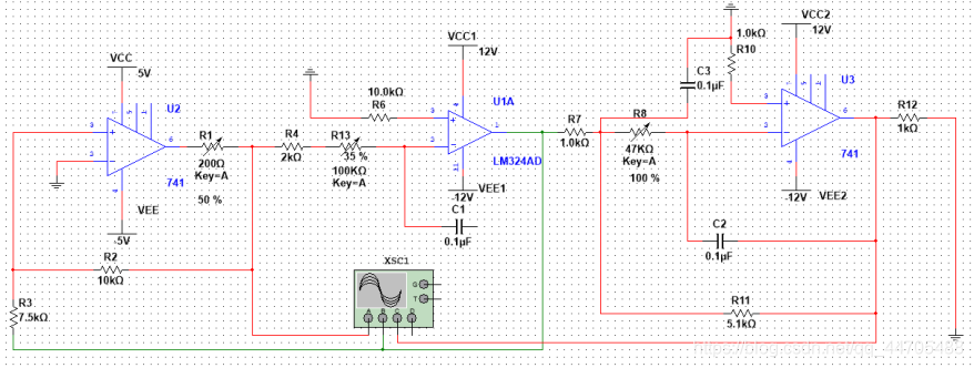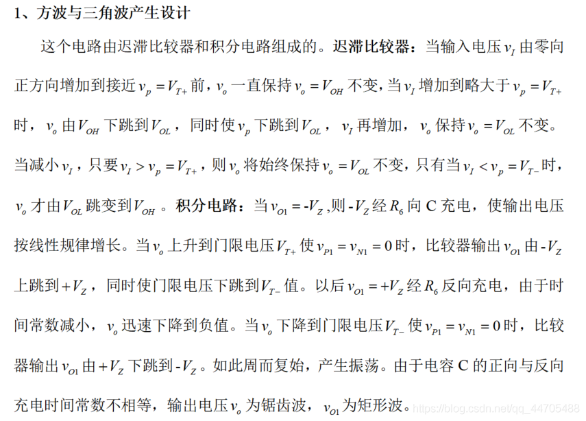 优点:该电路是将迟滞比较器、反向积分电路和差分电路结合起来的电路。产生的方波,三角波、正弦波的频率和幅值都是较容易调节,波形失真较小,差分放大器具有工作点稳定,输入阻抗高,抗干扰能力强。