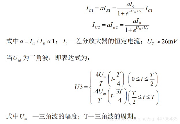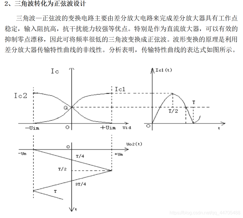 三角波—正弦波的变换电路主要由差分放大电路来完成差分放大器具有工作点稳定,输入阻抗高,抗干扰能力较强等优点。特别是作为直流放大器,可以有效的抑制零点漂移,因此可将频率很低的三角波变换成正弦波。波形变换的原理是利用差分放大器传输特性曲线的非线性。分析表明,传输特性曲线的表达式为: