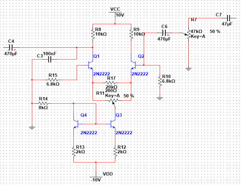 为使输出波形更接近正弦波:1、传输特性曲线越对称,线性区越窄越好。2、三角波的幅度Um应正好使晶体关接近饱和区或截止区。3、图2-9为实现三角波—正弦波变换的电路。其中R7调节三角波的幅度,R11调整电路的对称性,三角波中隔直电容C4、C6要取得较大,输出频率低,取得C4=C6=470uF,滤波电容C3=100nF滤除高频波形。