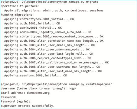 python manage.py migrate # 执行数据库迁移生成数据表 python manage.py createsuperuser # 按照提示输入账户和密码,密码强度符合一定的规则要求(管理员账号)