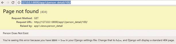 from django.shortcuts import render from django.http import HttpResponse, HttpResponseRedirect, Http404 from app1.forms import PersonForm from app1.models import Person def person_detail(request, pk): # url参数pk try: p = Person.objects.get(pk=pk) # 获取Person数据 except Person.DoesNotExist: raise Http404('Person Does Not Exist') # 获取不到抛出Http404错误页面 return render(request, 'person_detail.html', {'person': p}) # 返回详细信息视图