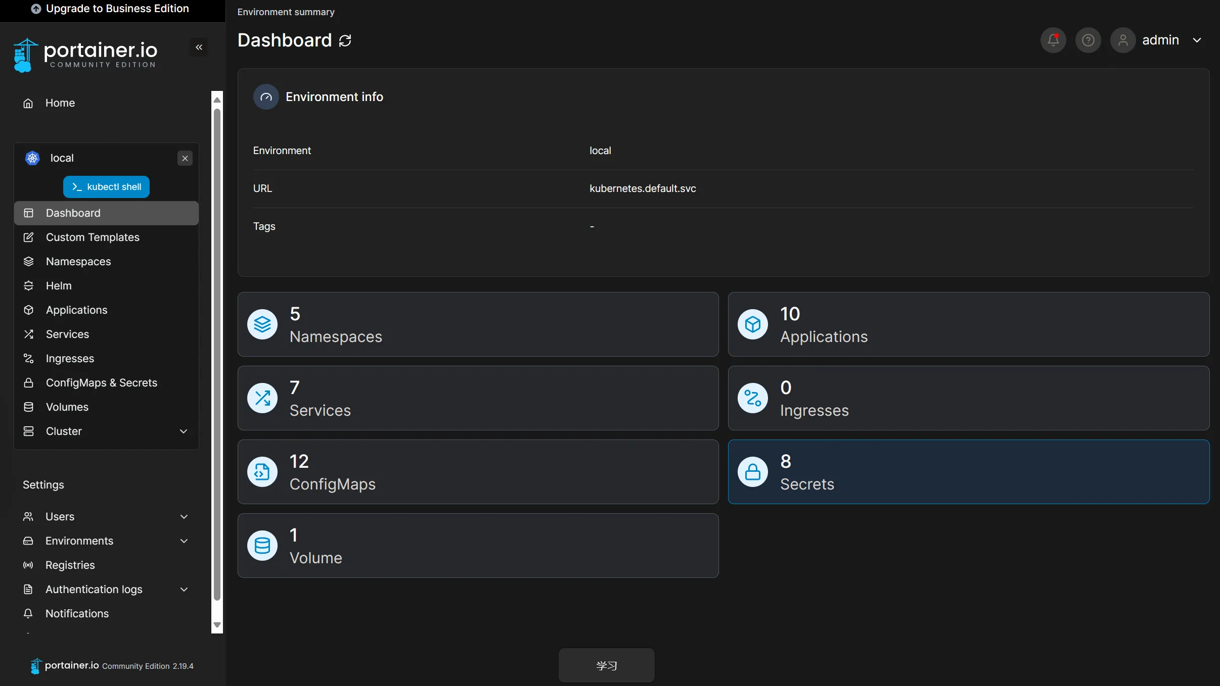 如果看教程看入迷了,启动了 portainer 之后过了五分钟没登录的话,再去浏览器访问 portainer 会收到提示 Your Portainer instance timed out for security purposes. To re-enable your Portainer instance, you will need to restart Portainer. 这时候要重启服务,直接重新 apply 一下就好了sudo kubectl apply -n portainer -f portainer.yaml,但这样还是得每五分钟去弄一下它。找到一个一劳永逸的方法。改一下 portainer.yaml 文件的检查周期livenessProbe.periodSeconds,改完记得重新 apply 一下。